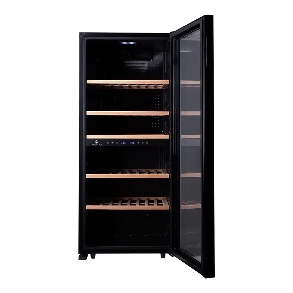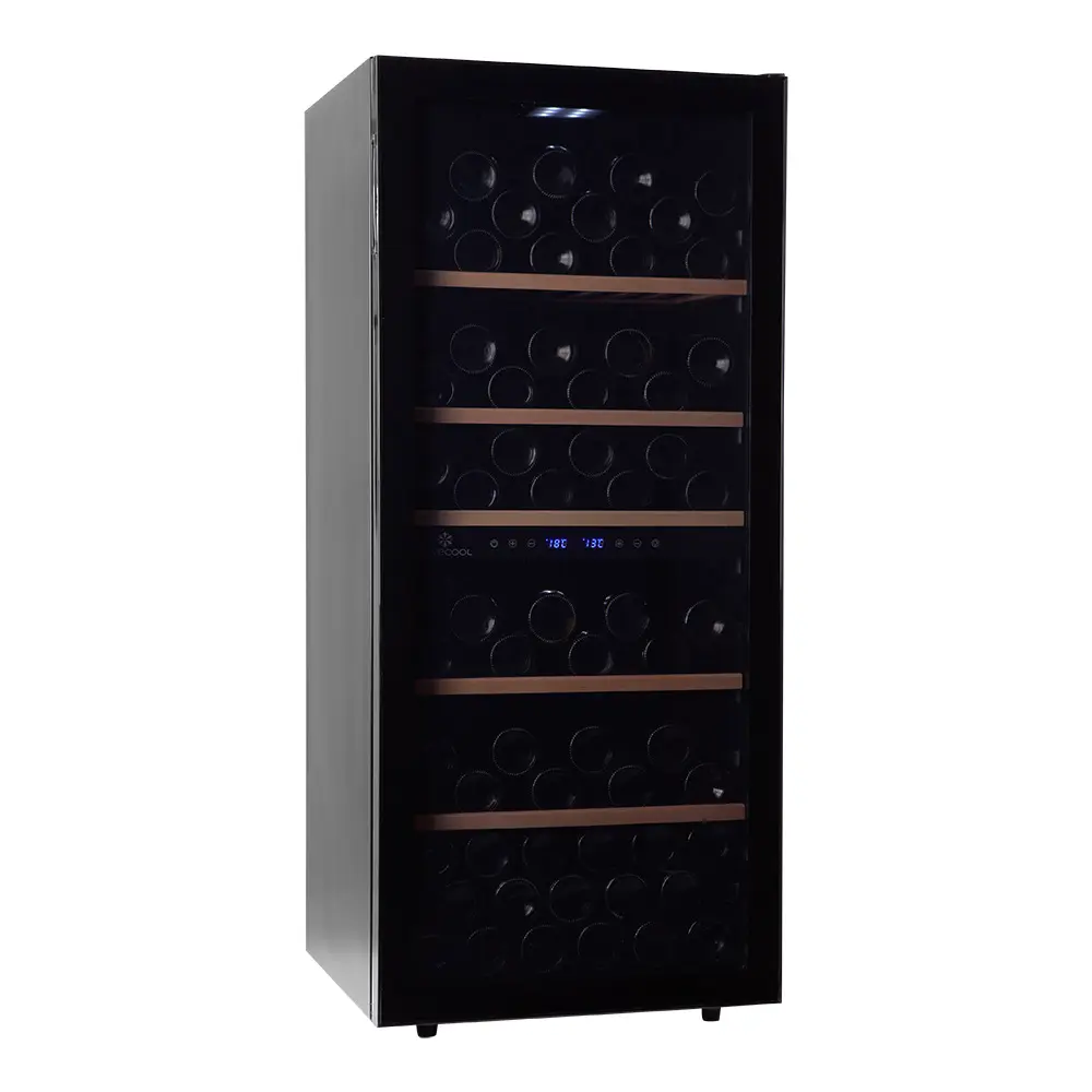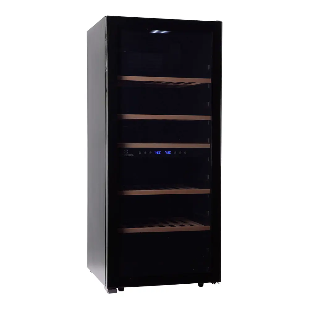 De verdeling van de capaciteit is praktisch en logisch opgebouwd: 56 flessen in de bovenste zone en 46 flessen in de onderste zone. De compressor zorgt voor een gelijkmatige koeling en voorkomt grote temperatuurschommelingen, wat essentieel is voor langdurige opslag.