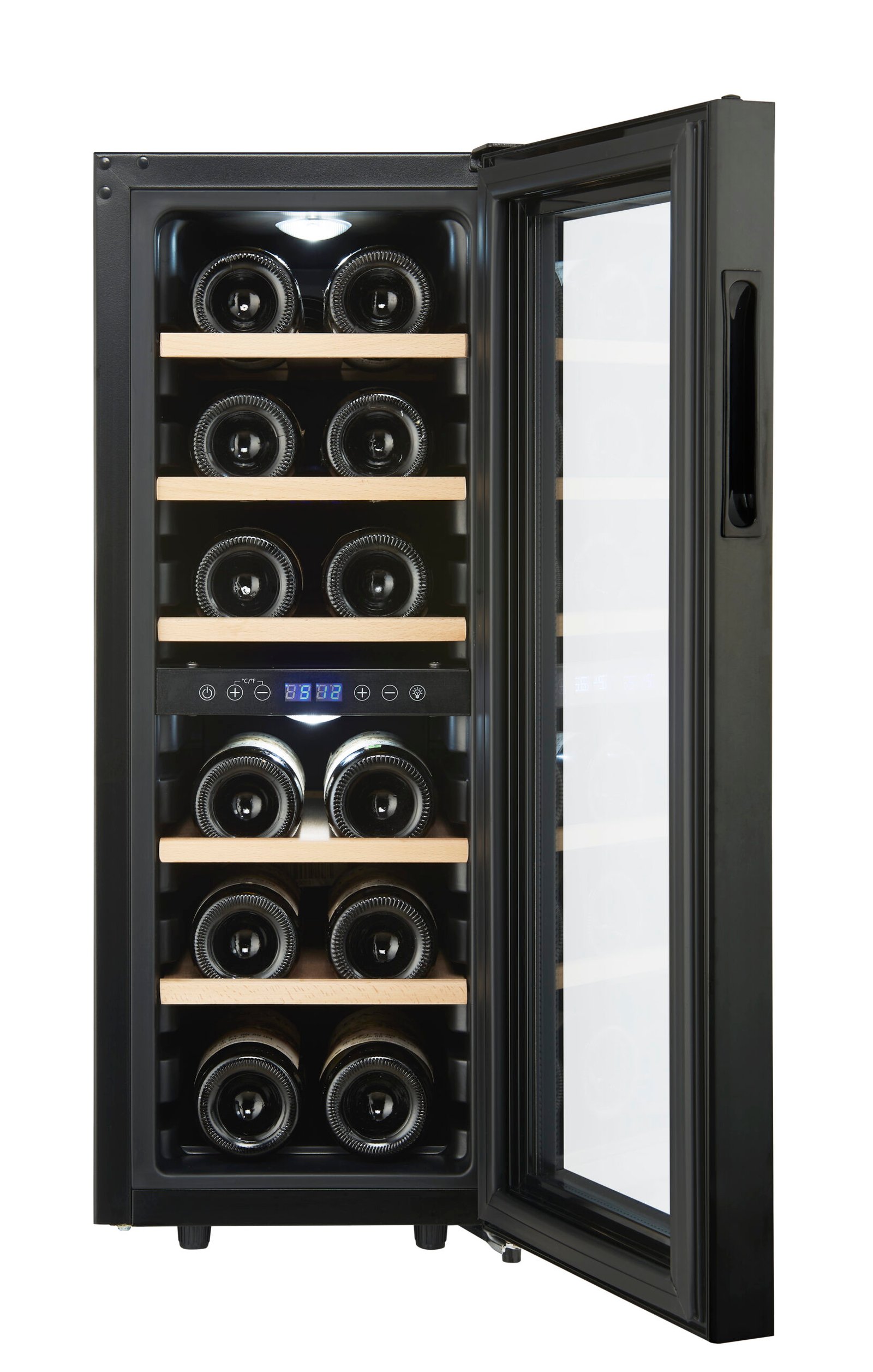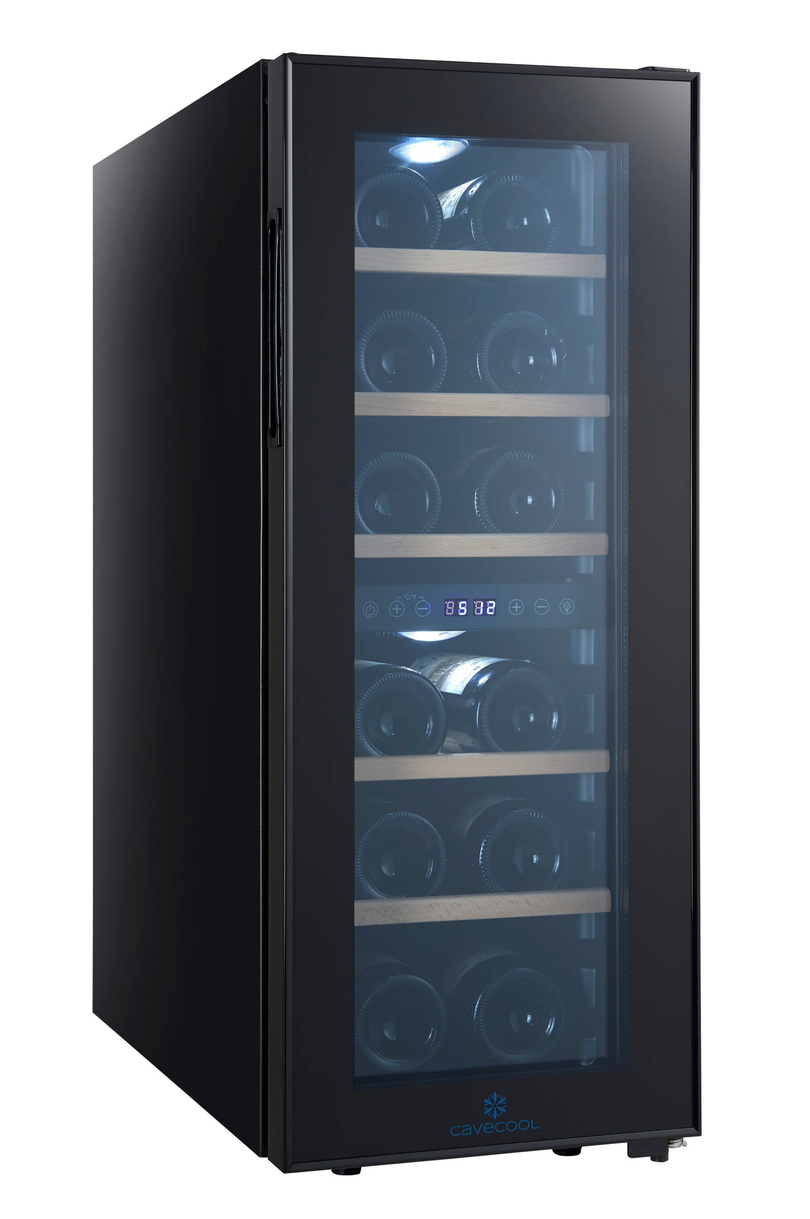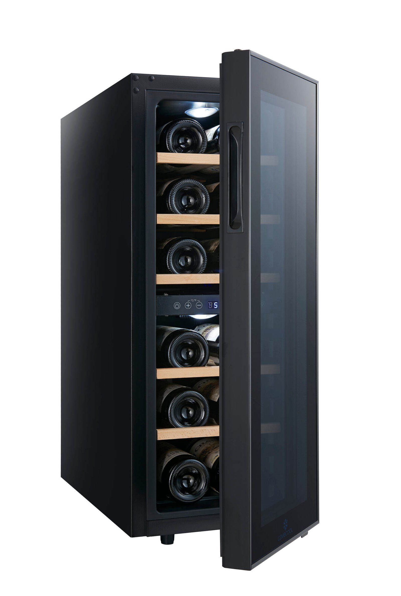 De zwarte glazen deur met UV-filter beschermt je wijn tegen lichtinvloeden, wat belangrijk is voor de kwaliteit op langere termijn. Het LCD-display maakt het instellen van de temperatuur eenvoudig en overzichtelijk.