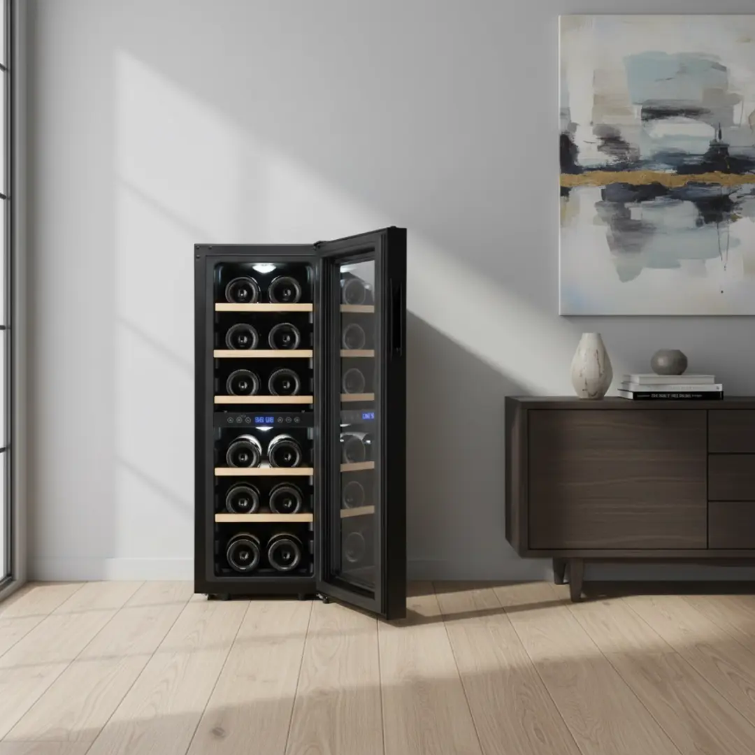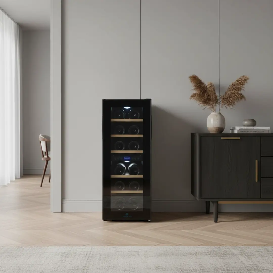 Met een capaciteit van 12 flessen is deze wijnkoelkast duidelijk bedoeld voor praktisch gebruik. Geen overdreven grote opslag, maar gewoon een overzichtelijke en toegankelijke kast waarin je wijn op de juiste temperatuur ligt. Precies wat de meeste mensen nodig hebben, ook al denken ze vaak dat ze meteen een halve wijnkelder moeten hebben.