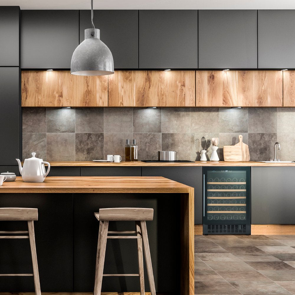 Een van de praktische eigenschappen van dit model is dat de wijnkoelkast geschikt is voor inbouw onder een aanrecht. De afmetingen sluiten goed aan op standaard keukenmodules.