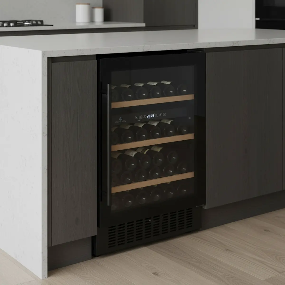De Cavecool Affection Jargon Essential Edition is een compacte maar veelzijdige wijnkoelkast met twee temperatuurzones en ruimte voor maximaal 46 Bordeauxflessen. Dankzij de breedte van 59,5 cm en een hoogte van 86,5 cm is dit model ideaal voor plaatsing onder een werkblad, maar het apparaat kan ook probleemloos vrijstaand worden gebruikt.