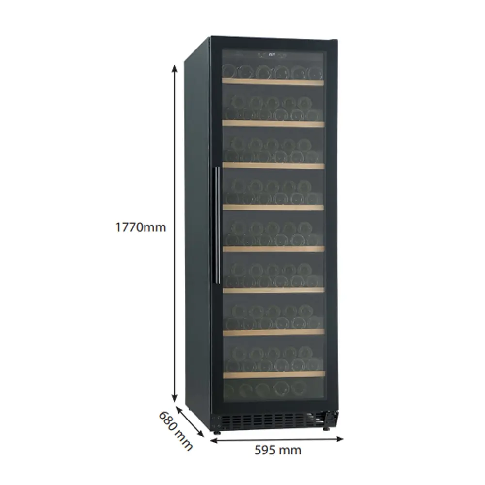 Met een hoogte van 177 cm is het een volwaardig vloerstaand model dat vergelijkbaar is met een hoge koelkast. Hierdoor kan een grote hoeveelheid wijn worden opgeslagen zonder meerdere kleinere wijnkoelkasten te gebruiken.