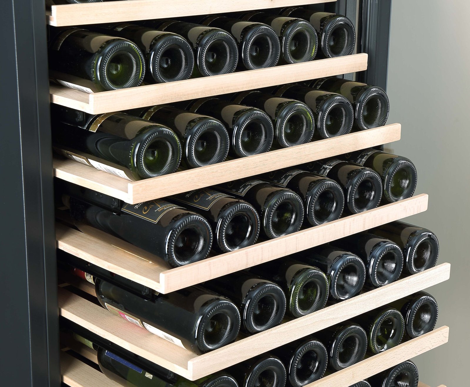 Met een maximale capaciteit van 171 Bordeauxflessen is deze wijnkoelkast ontworpen voor grotere collecties. De flessen worden geplaatst op 15 stevige planken van beukenhout, waardoor de wijn overzichtelijk en veilig kan worden opgeslagen.