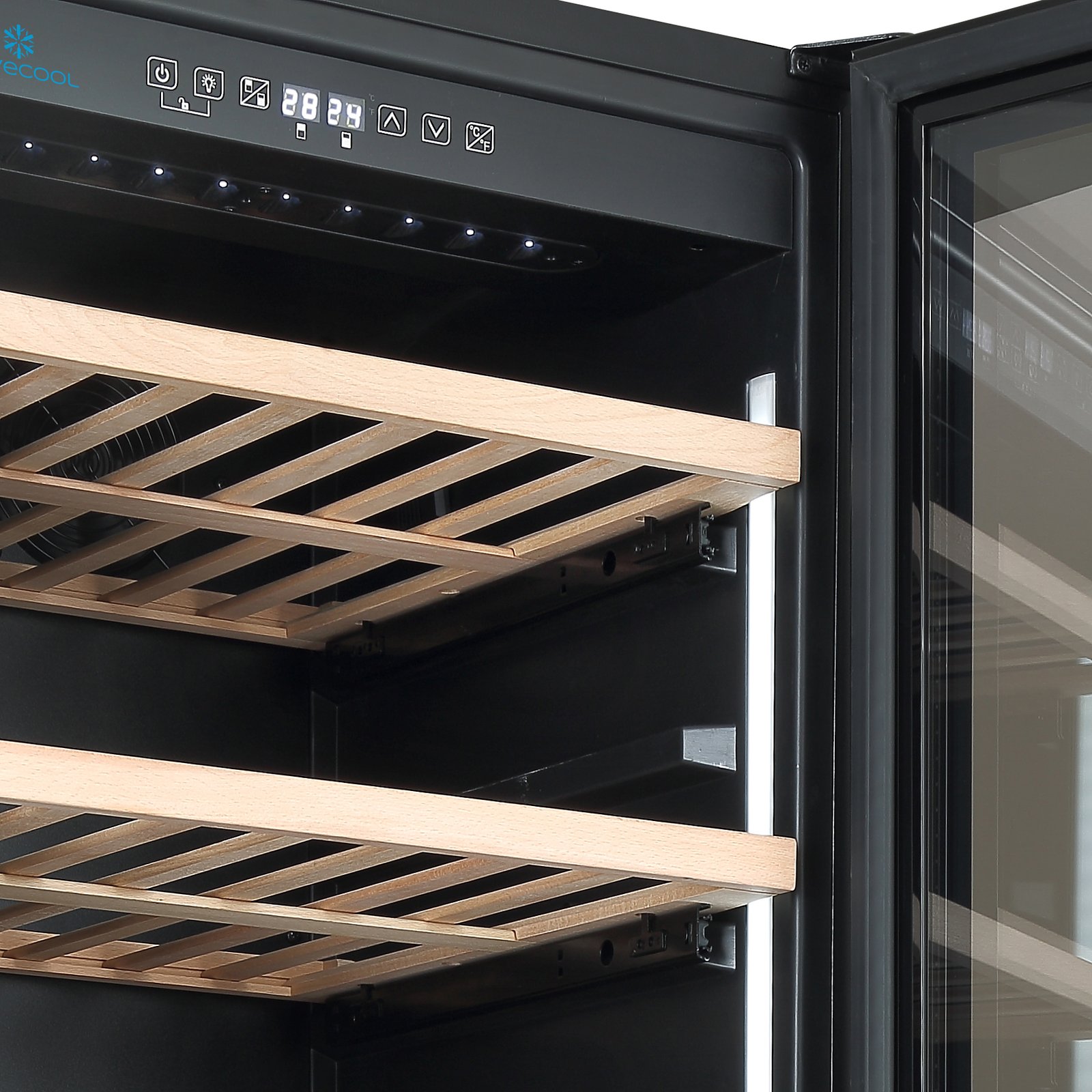 De verlichting is dimbaar in meerdere standen, wat niet alleen praktisch is, maar ook bijdraagt aan de uitstraling van je wijncollectie. Het LED-display maakt temperatuurinstellingen eenvoudig en overzichtelijk.