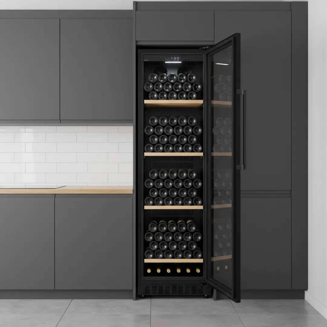 Het design is modern en tijdloos, met een zwarte afwerking en een UV-beschermde glazen deur met dubbele isolatie. De geïntegreerde witte LED-verlichting zorgt voor een helder overzicht van de inhoud zonder invloed op de temperatuur.