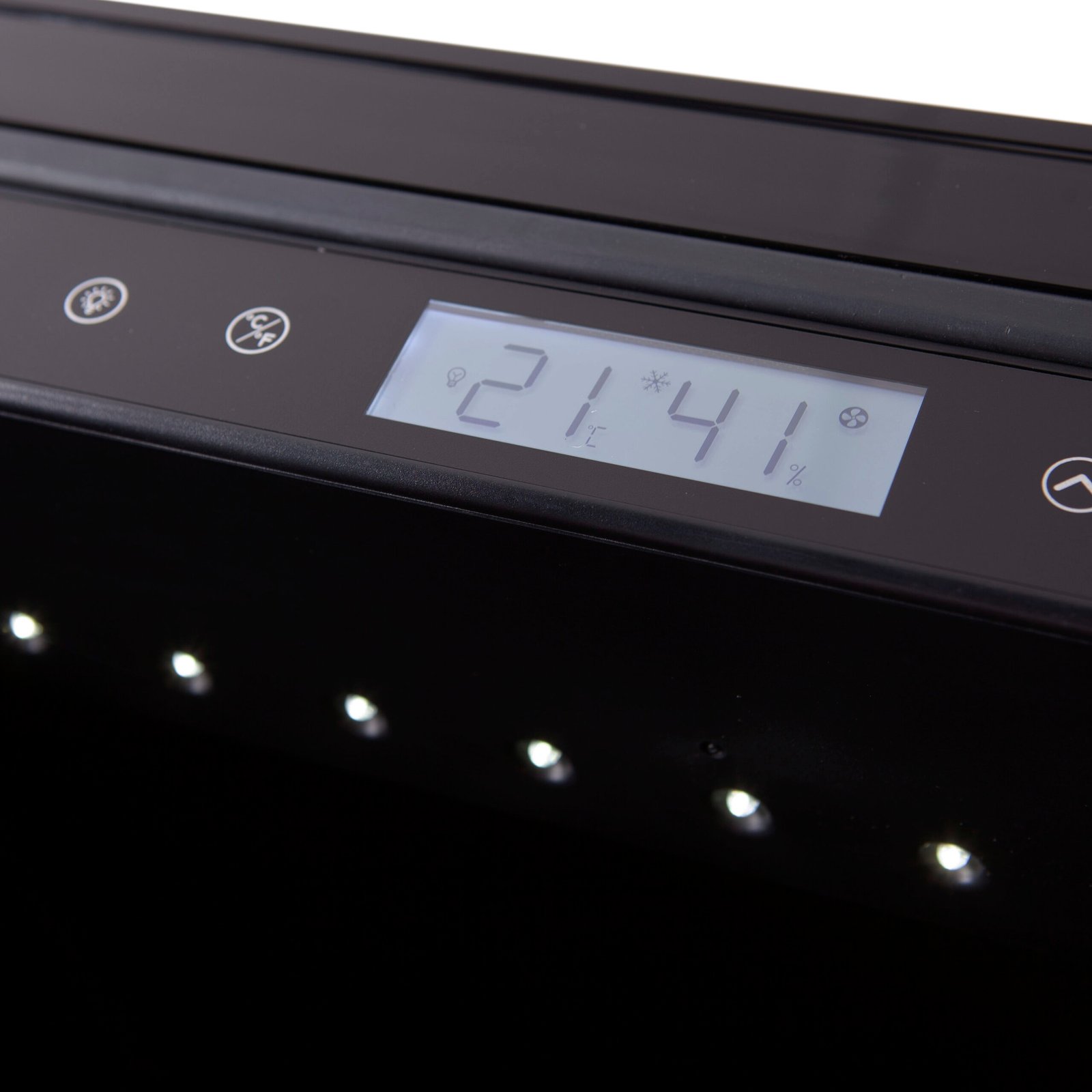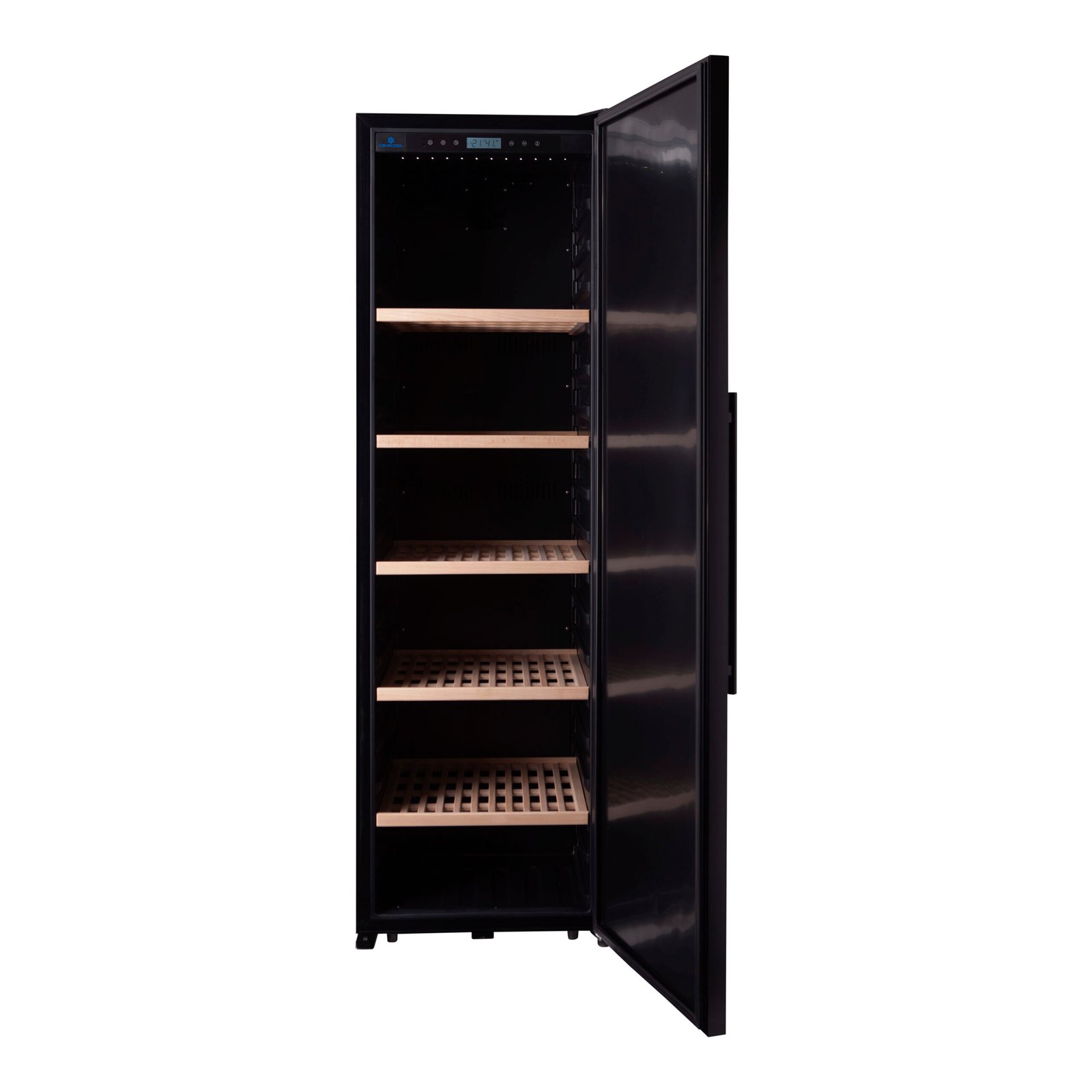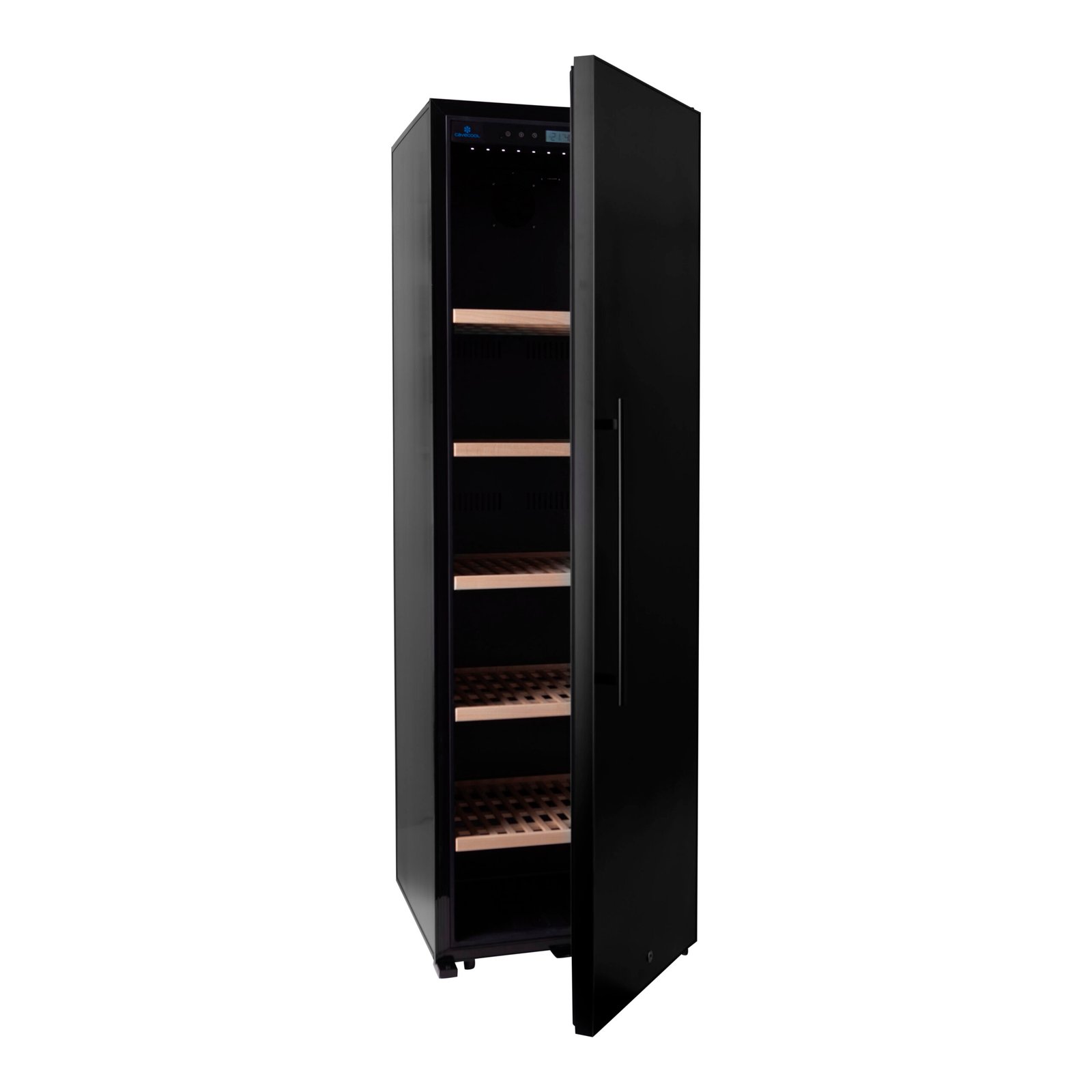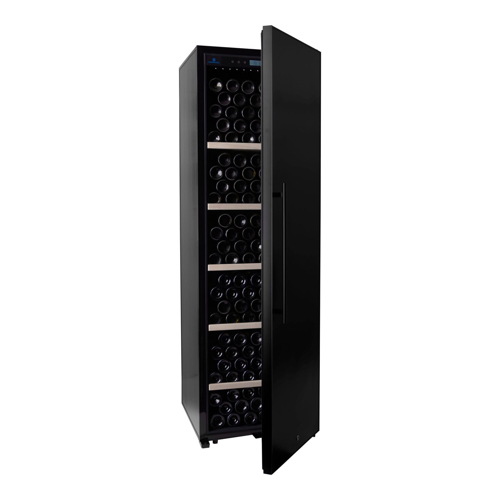 Een van de belangrijkste kenmerken van deze wijnkoelkast is de massieve deur met zwart aluminium frame. Waar glazen deuren vaak gekozen worden voor uitstraling, biedt een gesloten deur duidelijke functionele voordelen: